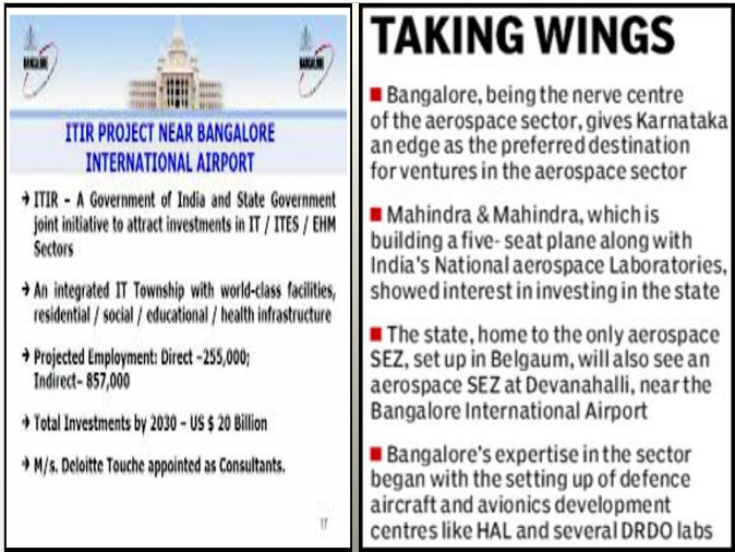 Aerospace SEZ in Devanahalli:- Aircraft maintenance, repair overhaul units to manufacture spare parts. Airbus, Lufthansa, CFM engines are some major plans showing interest.